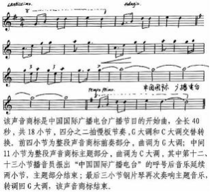 (该商标图样中文字说明为: 该声音商标是中国 国际广播电台广播节 目 的开始曲 , 全长40 秒 , 共 18 小节 , 四分之二拍慢板节奏 , C大调和 C大调交替转换 。 前四小节为 整段声音商标前奏部分 , 曲调为 C大调; 中间 11 小节为整段声音商标主题部分 , 曲调 为 C大调 , 其中第十二 、 十三小节播音员报出 " 中 国 国际广播电台 " 的呼号后音乐延 续两小节 , 主题部分结束; 最后三小节钢片琴再次奏响主题音乐 , 转调回 C大调 , 该 声音商标结束)