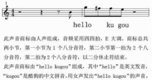 (该商标图样中文字说明为: 此声音商标由人声组成 , 音频采用四四拍 , E大调。 商 标总共两小节 , 第一小节为 1 个八分音符 , 第二小节第一拍为 2 个八分音符 , 第二拍为 2 个八分音符 , 以二分休止符结束。 此声音商标由 "helokugou" 组成 , 其中 "helo" 是 英文发音 , "kugou" 是酷狗的中文拼音 , 用女声发出 "helokugou" 的声音)