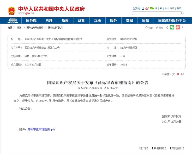 国家知识产权局关于发布《商标审查审理指南》的公告